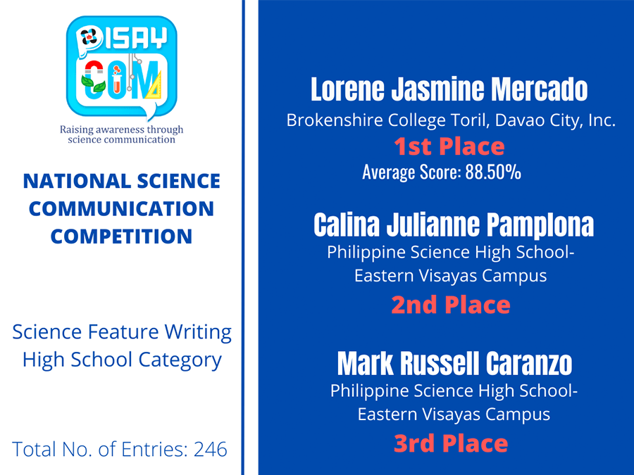 Two students from Philippine Science High School – Eastern Visayas Campus (PSHS-EVC) bagged 2nd and 3rd place under the Science Feature Writing Category of the PisayCom: National Science Communication Competition (NSCC) conducted last July 14 to October 1.